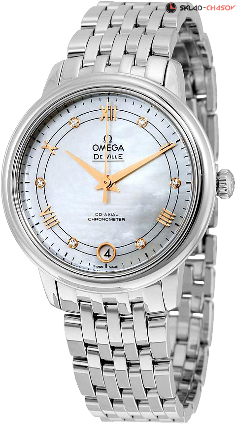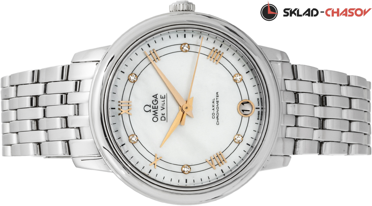 Элегантные женские часы. Мягкий и плавный корпус часов удерживается на 7-ми рядном металлическом браслете. перламутровый циферблат сделает данную модель ещё более яркой и заметной. В роли часовых индексов выступают 6 бриллиантов и 5 римских цифр. Апертура даты выполнена на отметке "6 часов". Оживают часы благодаря хронометрированному C.O.S.C. калибру Omega 2500.