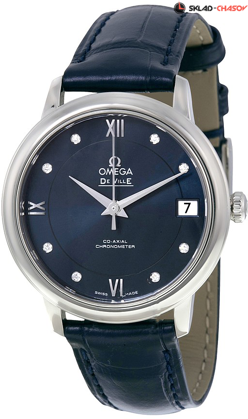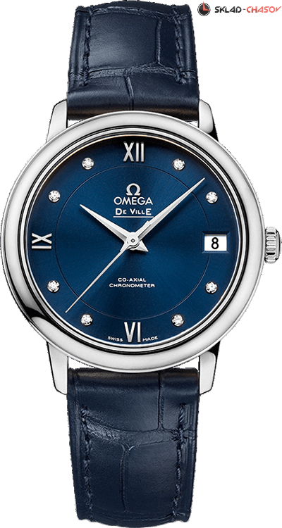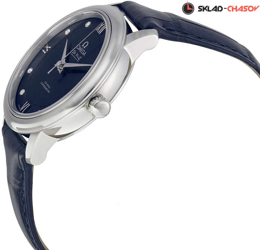 Элегантные женские часы. Мягкий и плавный корпус часов удерживается на ремешке из натуральной кожи. Сложный многоуровневый циферблат обработан методом сатинирования, благодаря чему отражает все оттенки насыщенного синего цвета. В роли часовых индексов выступают 8 бриллиантов. Апертура даты выполнена на отметке "3 часа". Оживают часы благодаря хронометрированному C.O.S.C. калибру Omega 2500.