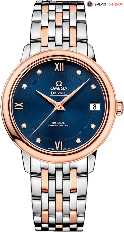 Элегантные женские часы. Корпус часов выполнен из комбинации стали и розового золота 18-ти карат, удерживаемый на 7-ми рядном металлическом браслете. Сложный многоуровневый циферблат обработан методом сатинирования, благодаря чему отражает все оттенки насыщенного синего цвета. В роли часовых индексов выступают 8 бриллиантов. Апертура даты выполнена на отметке "3 часа". Оживают часы благодаря хронометрированному C.O.S.C. калибру Omega 2500.