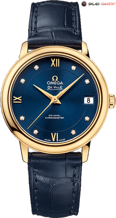 Элегантные женские часы. Корпус часов выполнен из жёлтого золота 18-ти карат. Сложный многоуровневый циферблат обработан методом сатинирования, благодаря чему отражает все оттенки насыщенного синего цвета. В роли часовых индексов выступают 8 бриллиантов. Апертура даты выполнена на отметке "3 часа". Оживают часы благодаря хронометрированному C.O.S.C. калибру Omega 2500.