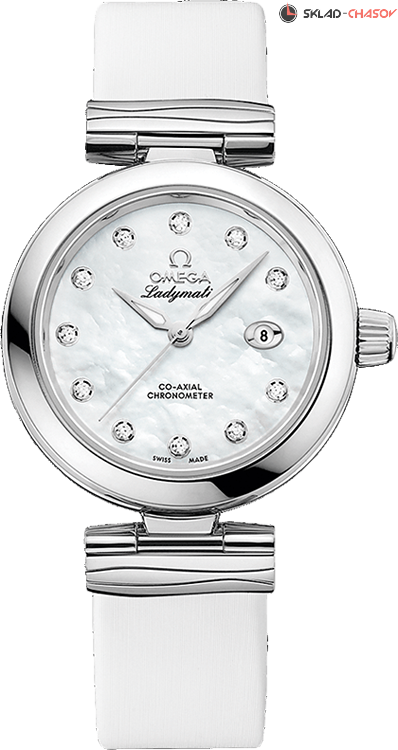 Ladymatic — истинная икона стиля, где современность встречается с винтажным шармом 1955 года. Корпус из нержавеющей стали с изящными волнообразными звеньями дополнен белоснежным кожаным ремешком, создавая ощущение воздушной легкости. Стрелки из белого золота формы "альфа" и 11 сверкающих бриллиантовых индексов танцуют на переливающемся циферблате из белого перламутра, словно солнечные блики на морской глади. Окошко даты на "3 часах" добавляет практичности, сохраняя безупречную эстетику. Внутри этой поэзии из стали и света бьется сердце истинной леди — коаксиальный механизм OMEGA калибра 8520, символ вечной женственности и часового совершенства.