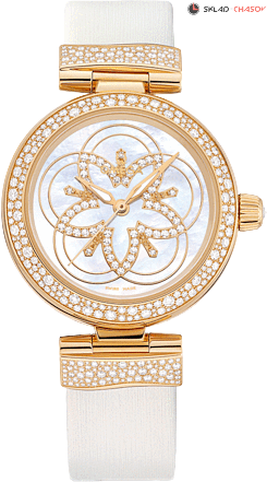 Хронометр C.O.S.C., завинчивающаяся заводная головка украшена 1 бриллиантом весом 0.08 ct, прозрачная задняя крышка, перламутровый циферблат украшают 60 бриллиантов общим весом 0.28 ct, безель украшен 184 бриллиантами общим весом 1.04 ct, звенья ремешка украшены 144 бриллиантами общим весом 0.60 ct