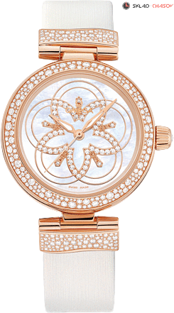 Хронометр C.O.S.C., завинчивающаяся заводная головка украшена 1 бриллиантом весом 0.08 ct, прозрачная задняя крышка, перламутровый циферблат украшают 60 бриллиантов общим весом 0.28 ct, безель украшен 184 бриллиантами общим весом 1.04 ct, звенья ремешка украшены 144 бриллиантами общим весом 0.60 ct