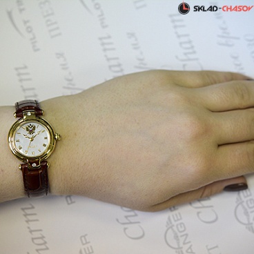 Скромный корпус с покрытием цвета желтого золота смотрится сдержанно, но элегантно. Отсутствие лишнего декора позволяет модели вписываться в любой образ и прекрасно гармонировать с другими аксессуарами в классическом стиле. Белый циферблат с золотыми римскими цифрами декорирован лишь государственной российской символикой. Мягкий коричневый ремешок из натуральной кожи удобно фиксирует часы на запястье.