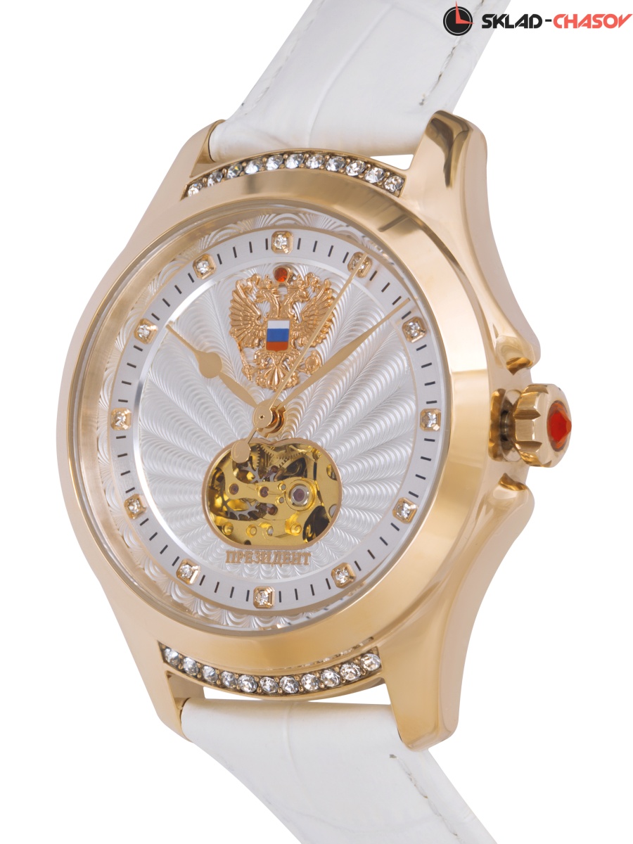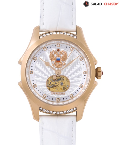 Женские механические часы серии Президент – достойная модель для современной, активной, уверенной в себе леди. Дизайн данной модели выполнен в классическом стиле и отличается продуманным балансом между лаконичностью и женственностью. Корпус цвета розового золота украшен миниатюрными кристаллами Сваровски. Красивый белый циферблат с белым ремешком из натуральной кожи высокого качества хорошо гармонируют с любыми другими аксессуарами.