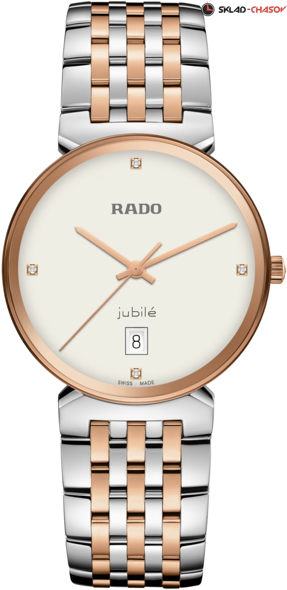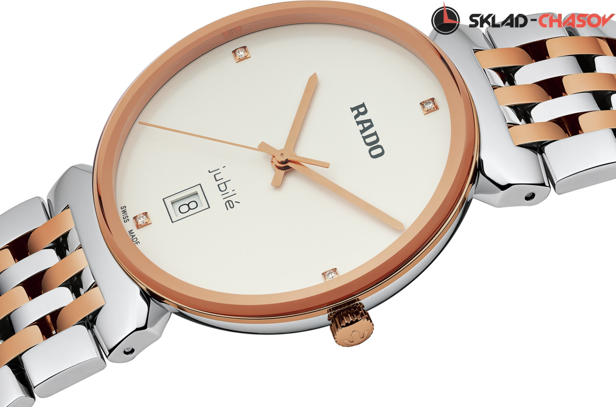 Женская модель в комбинированном исполнении, белый циферблат украшен бриллиантами.