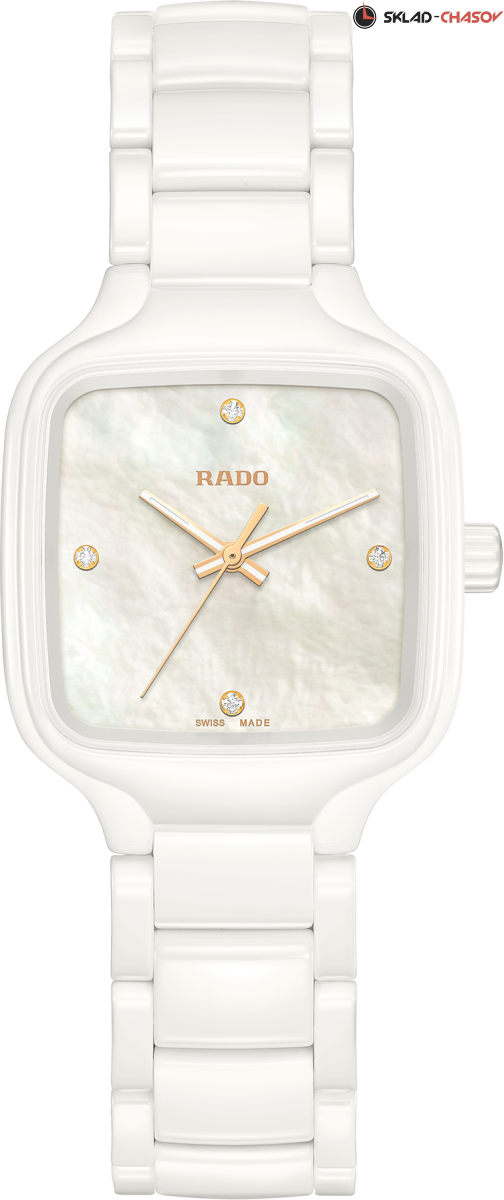 Модель True Square — это новый взгляд на знаменитую форму часов Rado. Первые часы в корпусе моноблок квадратной формы из высокотехнологичной керамики. Перламутровый циферблат украшен 4 бриллиантами общим весом 0.032 ct.