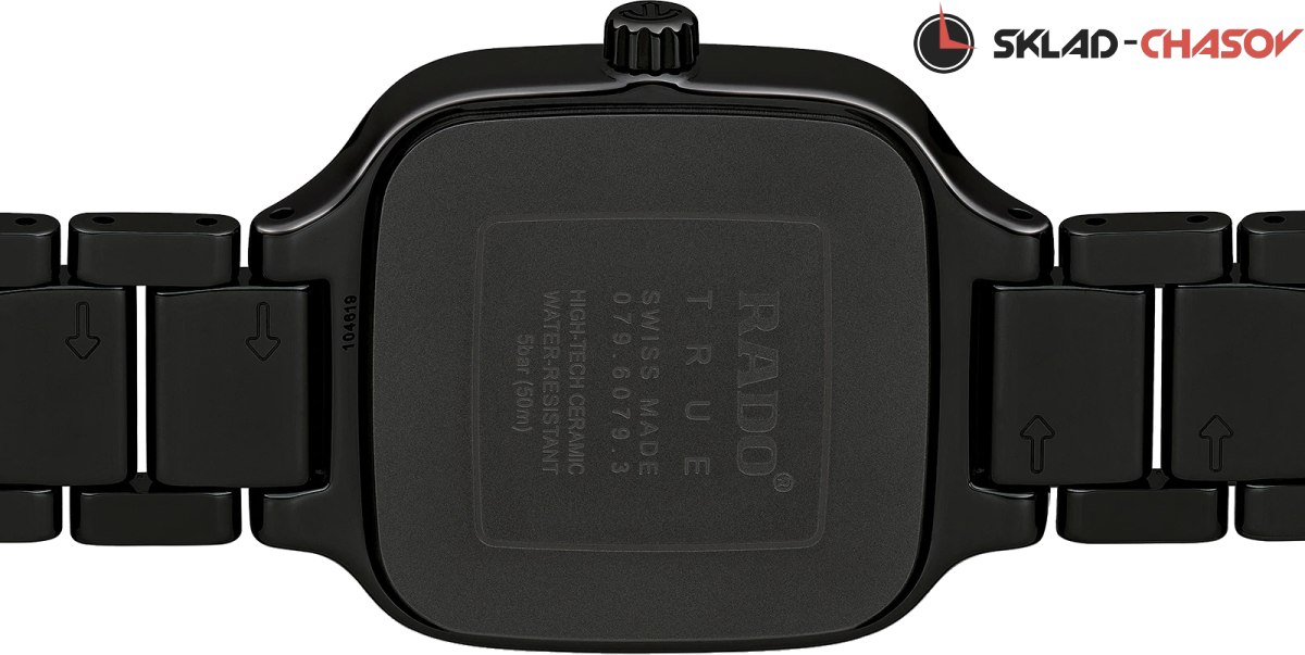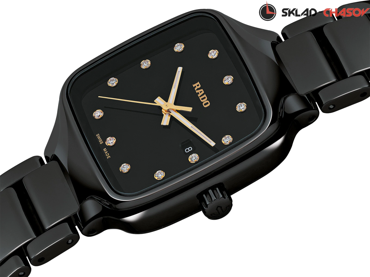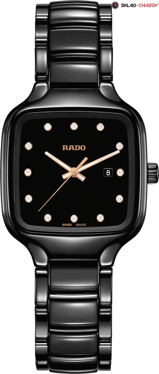 Модель True Square — это новый взгляд на знаменитую форму часов Rado. Первые часы в корпусе моноблок квадратной формы из высокотехнологичной керамики. 12 бриллиантов на циферблате (0.096ct). Апертура даты в районе 3 часов.