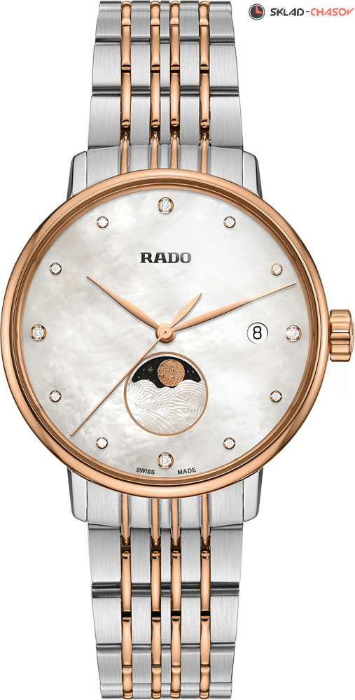 Женская модель, украшена бриллиантами вместо разметки, индикация фазы луны на 6 часах, индикация даты в положении 3 часа.