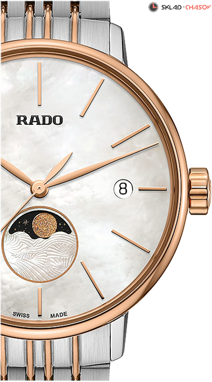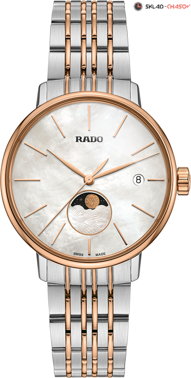 Женская модель, комбинированный браслет, индикация фазы луны на 6 часах, индикация даты в положении 3 часа.