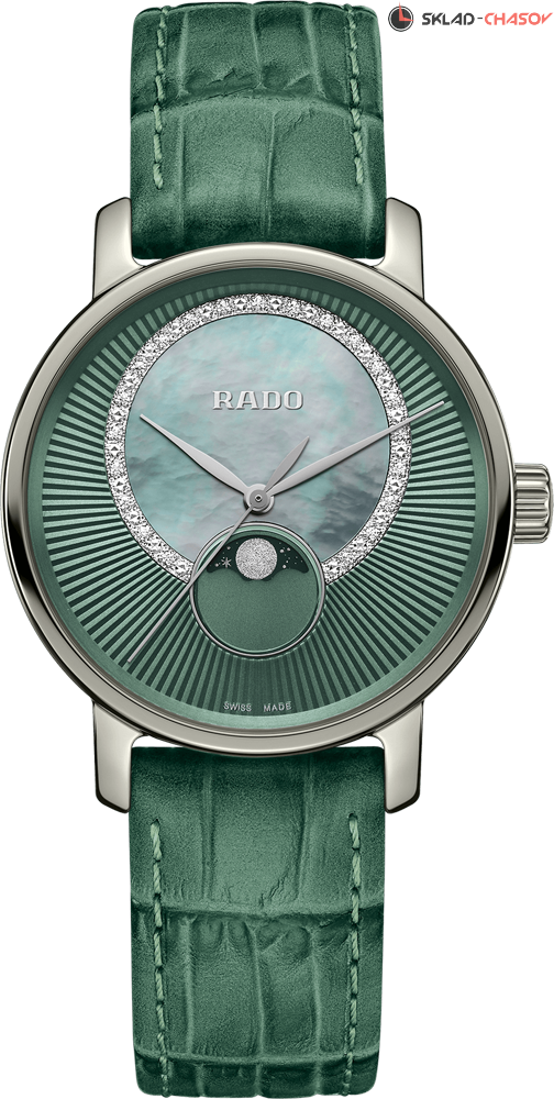 Монолитный керамический корпус. Циферблат этой женской модели выполнен из окружностей насыщенного цвета, украшенных 21 бриллиантами 0,06ct и перламутром.