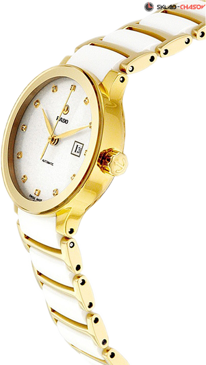 Женская модель, индикация часов, минут и секунд центральными стрелками, окошко даты в положении 3 часа, циферблат украшен 12 бриллиантами общим весом 0.0252 ct