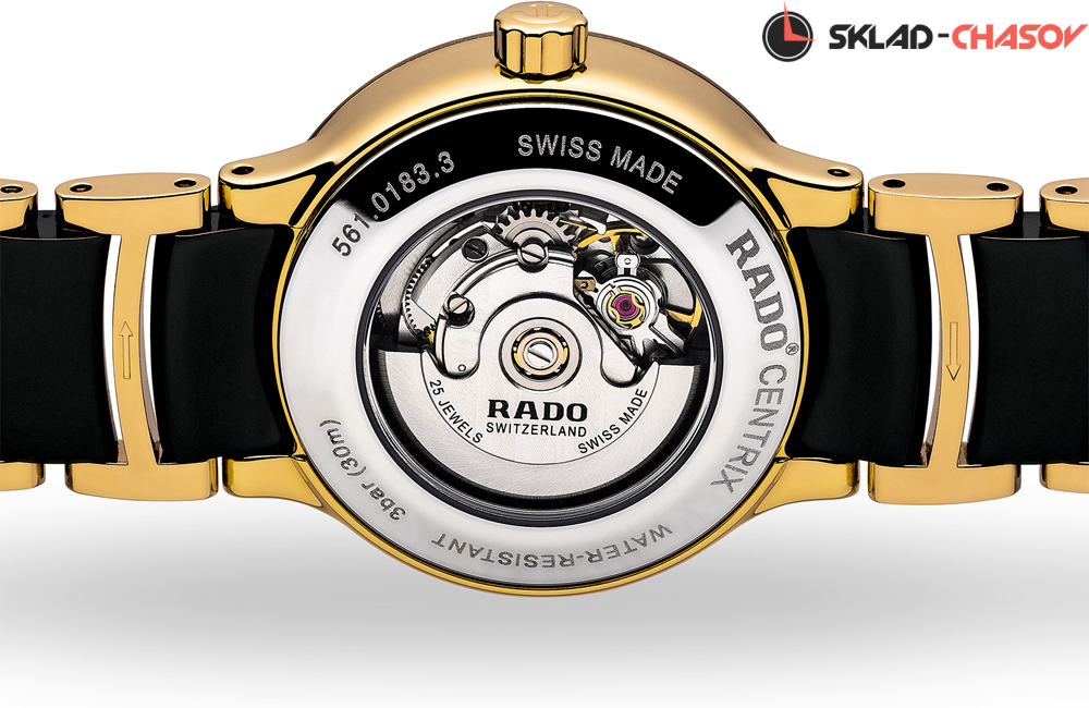 Классическая модель Centrix дополнена автоматическим механизмом. Апертура даты в положении 3 часов. Циферблат украшен 12 бриллиантами 0,025ct.