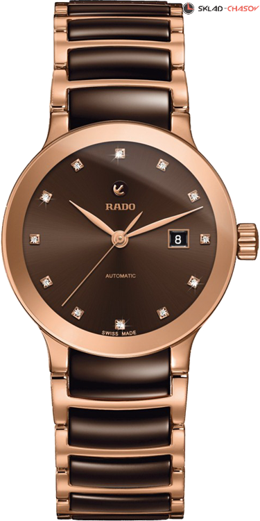 Женская модель, индикация часов, минут и секунд центральными стрелками, окошко даты в положении 3 часа, циферблат украшен 12 бриллиантами общим весом 0.0252 ct