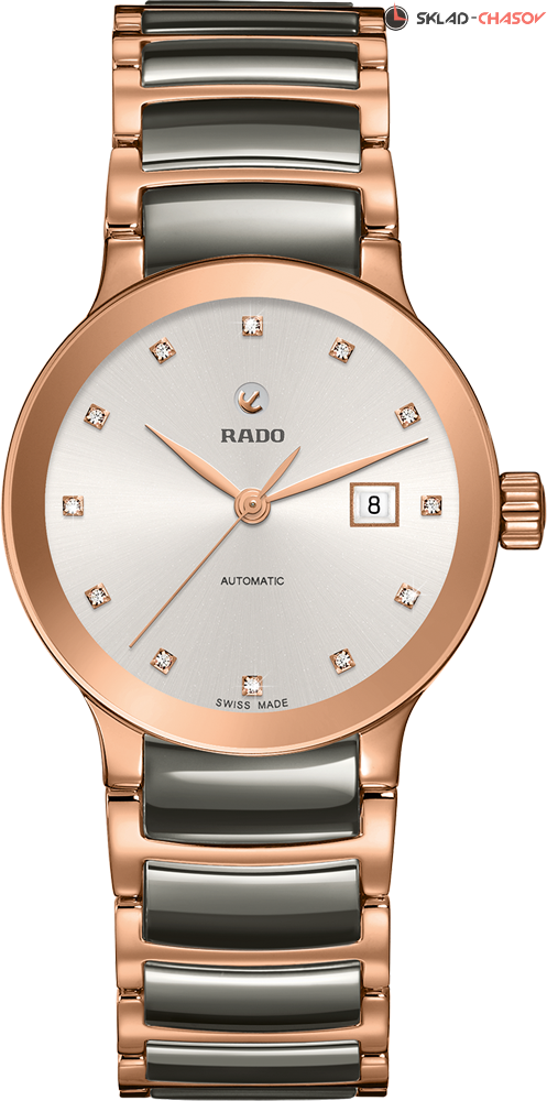 Классическая модель Centrix дополнена автоматическим механизмом. Апертура даты в положении 3 часов. Циферблат украшен 12 бриллиантами 0,025ct.