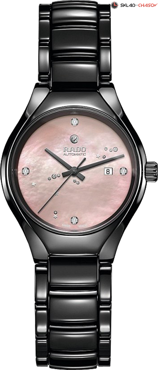 Женская модель, индикация часов, минут и секунд центральными стрелками. Циферблат украшен 14 бриллиантами.