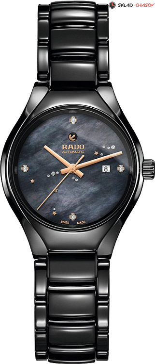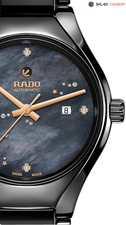 Женская модель, индикация часов, минут и секунд центральными стрелками. Циферблат украшен 14 бриллиантами.