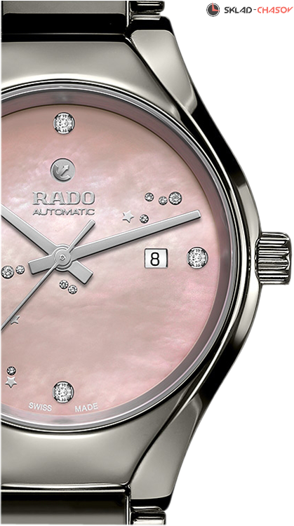 Женская модель, индикация часов, минут и секунд центральными стрелками. Циферблат украшен 14 бриллиантами.