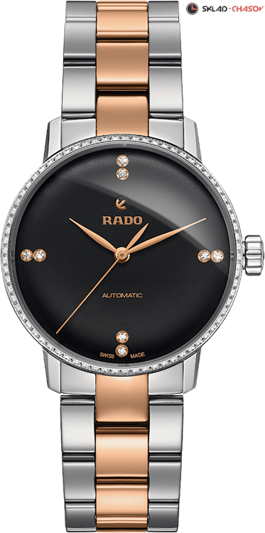 Женская модель, индикация часов, минут и секунд центральными стрелками. Безель украшен 72 бриллиантами 0.259 ct, на циферблат 8 бриллиантов 0.052 ct
