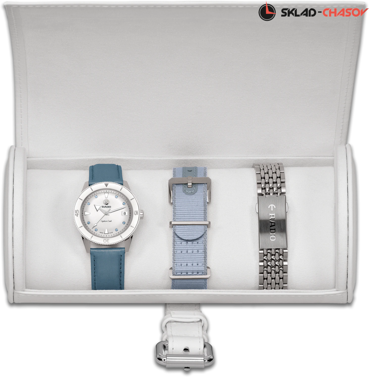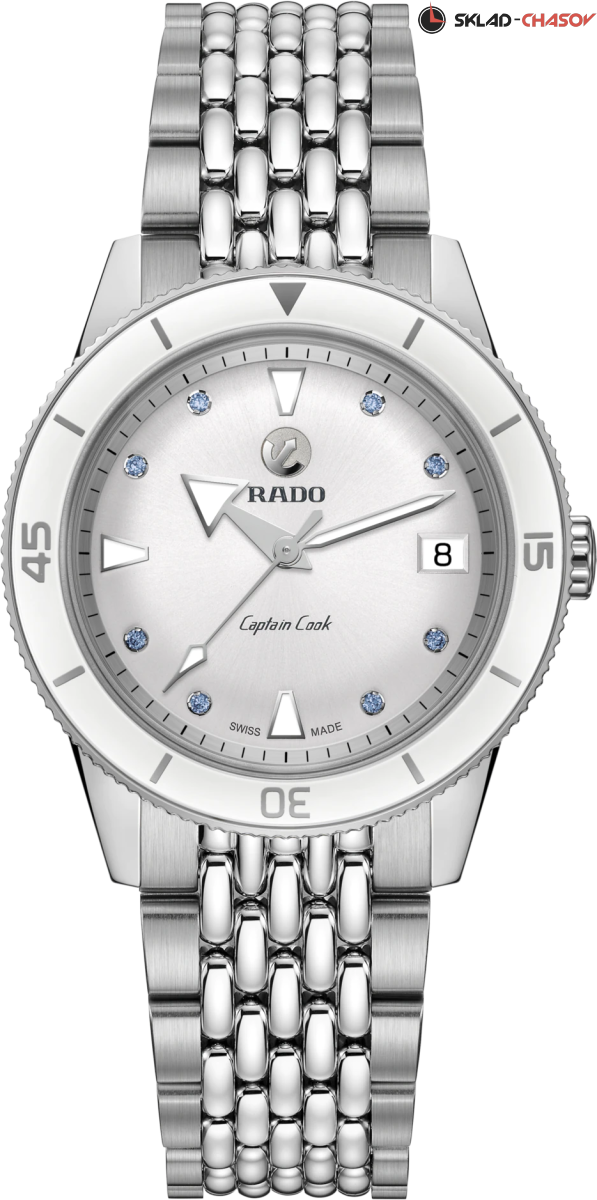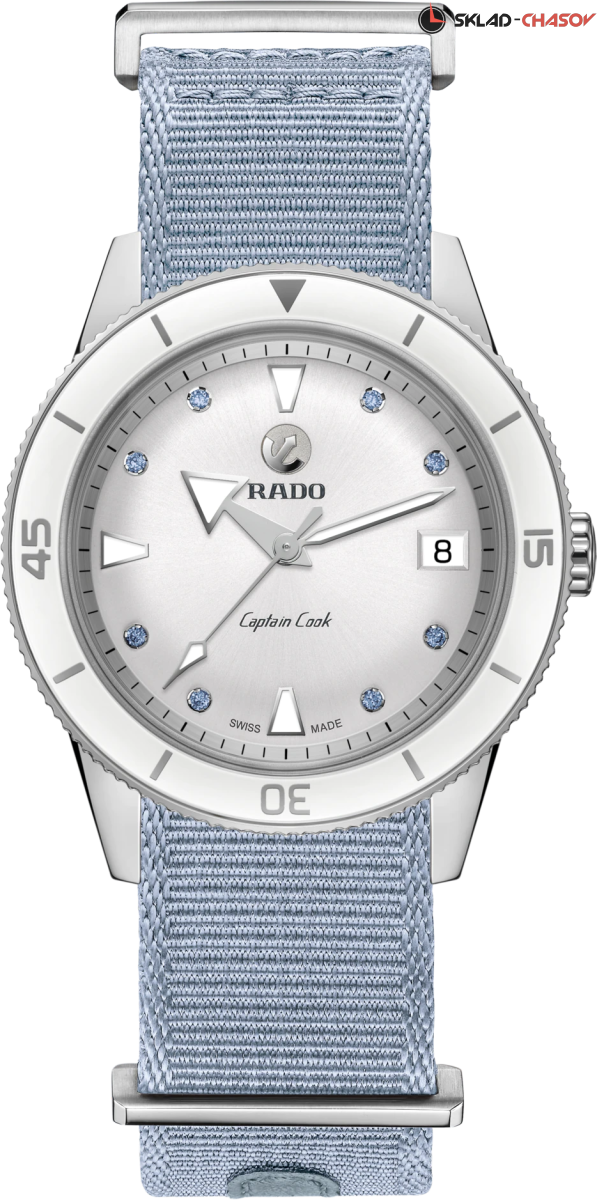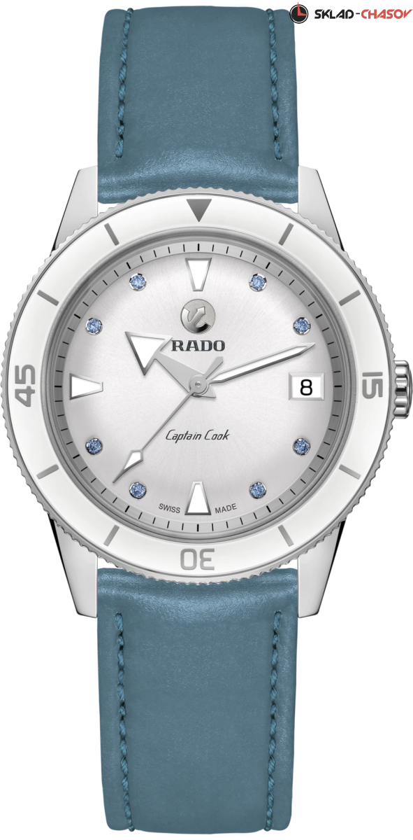 Rado Captain Cook x Julia Peresild — стала современной интерпретацией часов Rado. Белоснежный циферблат украшают восемь сапфиров холодного голубого оттенка и выполняют роль часовых отметок. Безель из белой высокотехнологичной керамики. Лимитированная модель часов Юлии выпущена в количестве 301 экземпляр, а задняя крышка имеет выгравированный порядковый номер серии (XXX/301). Модель поставляется с двумя ремешками и стальными браслетом. Ремни и браслеты быстро и легко заменяются благодаря системе EasyClip. Часы представлены в специальном дорожном кожаном кейсе белого цвета.