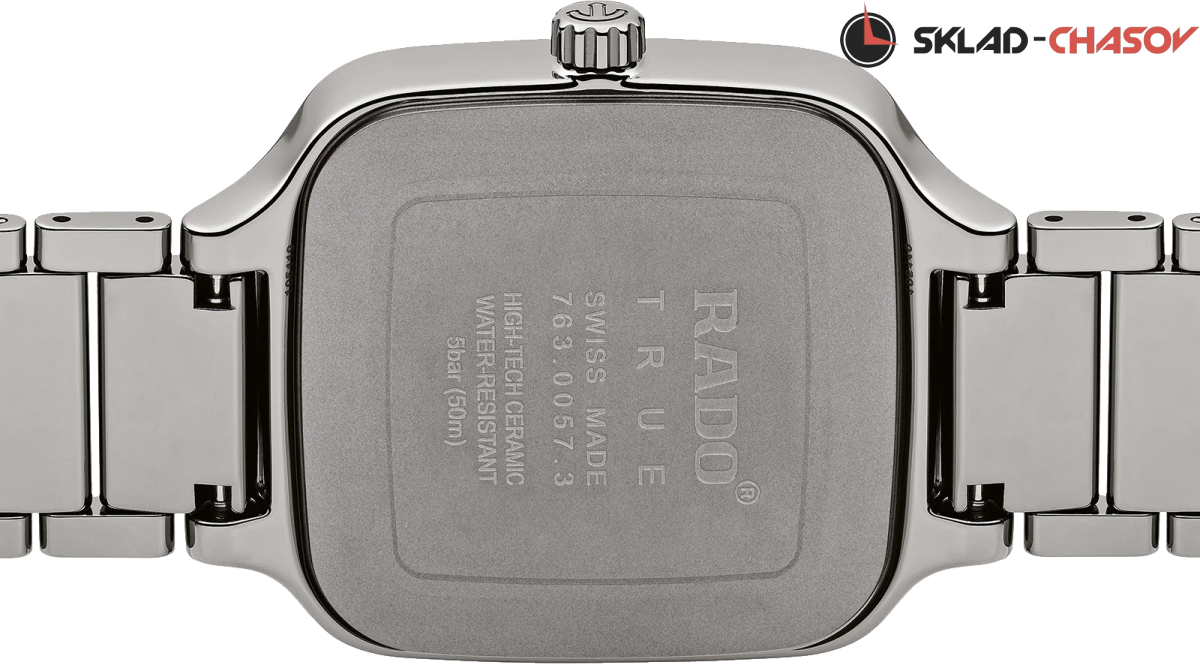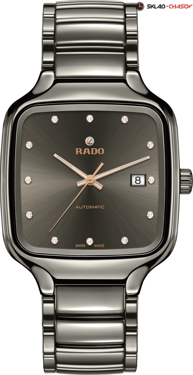 Модель True Square — это новый взгляд на знаменитую форму часов Rado. Первые часы в корпусе моноблок квадратной формы из высокотехнологичной керамики. 12 бриллиантов на циферблате (0.12ct). Апертура даты в районе 3 часов.