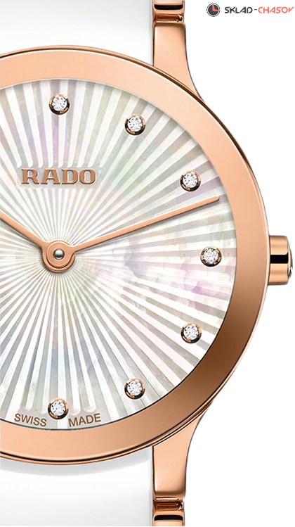 Циферблат из натурального перламутра украшен 12 бриллиантами общим весом 0,025 ct.