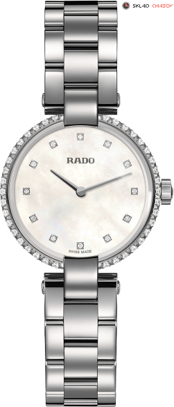 Женская модель, индикация часов и минут центральными стрелками, перламутровый циферблат и корпус украшены 38 бриллиантами общим весом 0.3 ct