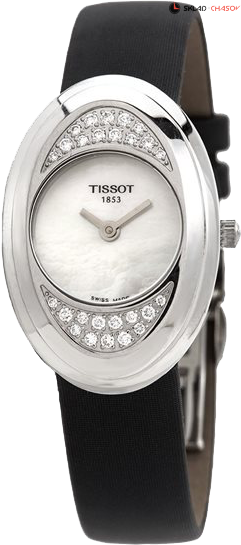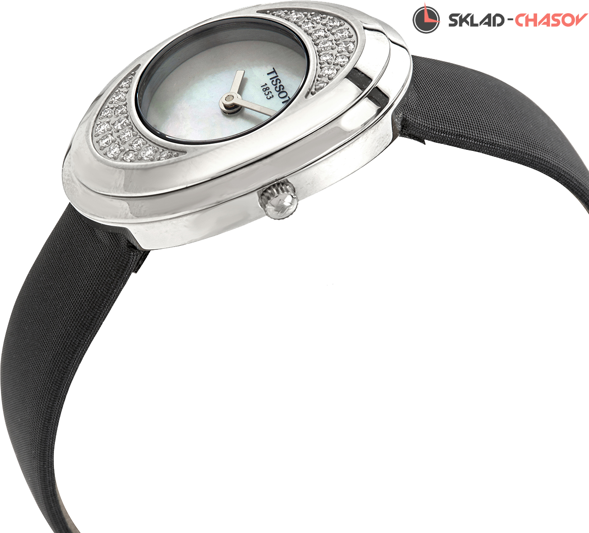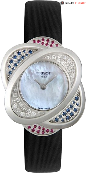 "Элегантные женские часы с секретом. Овальный корпус часов раскрывается в форме цветка усыпанного бриллиантами и голубыми сапфирами. Перламутровый циферблат. Модель дополнена сатиновым ремешком.