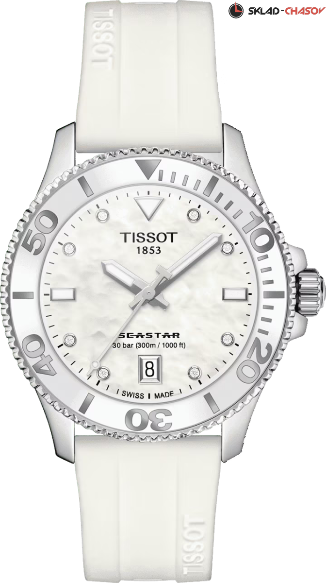 Женская модель для поклонников водных видов спорта. Однонаправленно вращающийся безель с минутной шкалой, окошко даты в положении 6 часов, люминесцентное покрытие на разметке и стрелках.