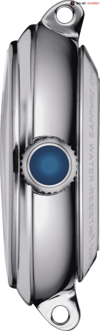 Изящные, тонкие женские часы обладают небольшим диаметром корпуса 29 мм и высотой 9.6 мм. Гильошированный циферблат. Заводная головка украшена кабошоном.