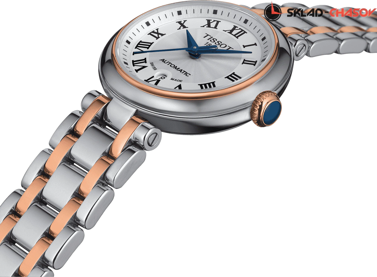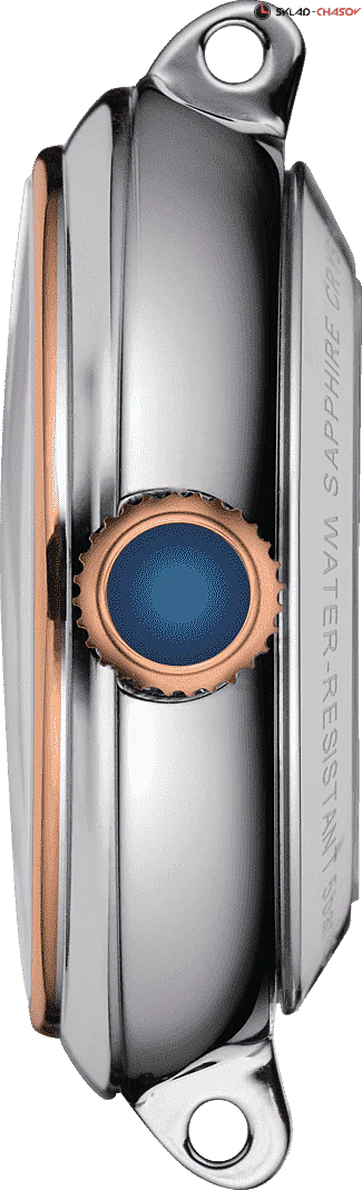 Изящные, тонкие женские часы обладают небольшим диаметром корпуса 29 мм и высотой 9.6 мм. Гильошированный циферблат. Заводная головка украшена кабошоном.