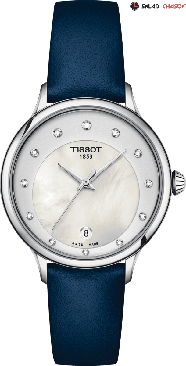 Классическая женская модель, перламутровый циферблат украшен 12-ю бриллиантами общим весом 0.0361 карат.