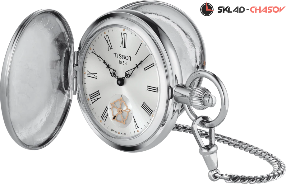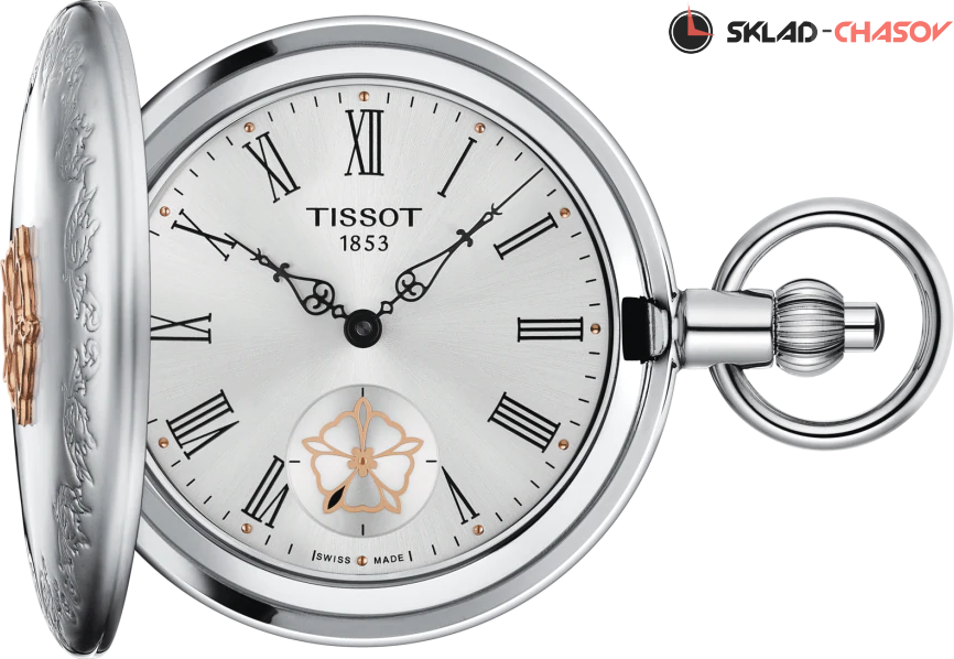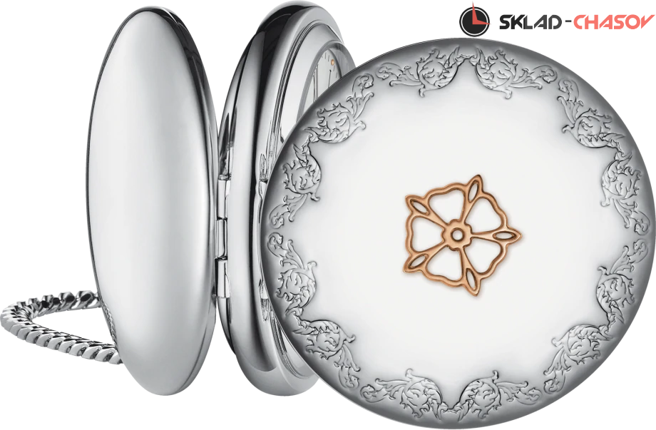 Классические карманные часы с вынесенной секундной стрелкой, выполненной в виде фирменного цветка марки. Внешняя крышка украшена узорами.