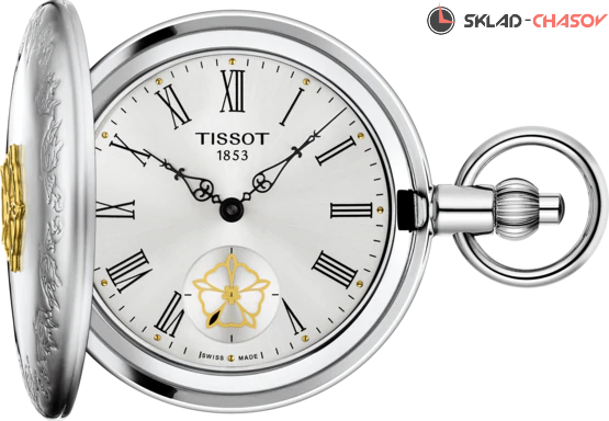 Классические карманные часы с вынесенной секундной стрелкой, выполненной в виде фирменного цветка марки. Внешняя крышка украшена узорами.