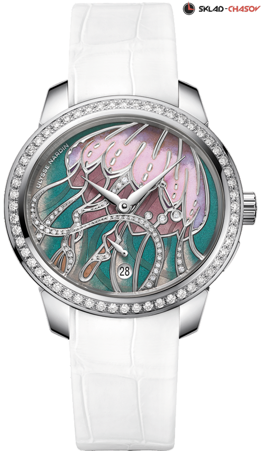 Jade “Jellyfish”: прекрасное сочетание функциональности и стиля. Корректировка показателей (часы, дата, завод) производится простым нажатием на специальную кнопку, интегрированную в заводную головку. Циферблат модели изготовлен при помози техники выемчатой эмали, выполненная мастерами фабрики Donz Cadrans, а так же декорирован 114 бриллиантами.