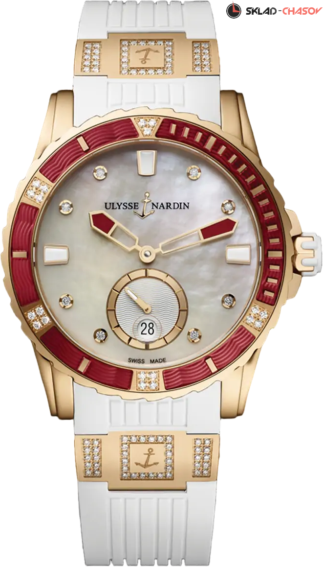 Дизайн часов был вдохновелен морскими просторами. Безеле с каучуковыми вставками красного цвета и мотивами морских волн, украшен 19 бриллиантами. Эти же волны мы сможем увидеть на секундном счетчике в положении на 6 часов. Перламутровый циферблат с 8 бриллиантами круглой огранки вместо меток. По центру грациозно скользят часовая и минутная стрелки с красным люминесцентным покрытием.