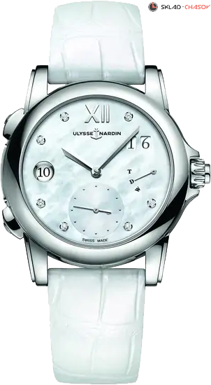 Корпус часов изготовлен с высококачественной нержавеющей стали, синий инкрустирован семью бриллиантами общим весом 0,107 карат. Вынесенная секундная стрелка на 6 часах, индикатор запаса хода на 3 часах, дата на 2 часах, на 9 часах индикация домашного времени.