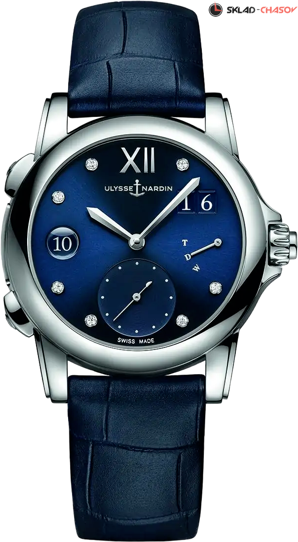 Корпус часов изготовлен с высококачественной нержавеющей стали, синий инкрустирован семью бриллиантами общим весом 0,107 карат. Вынесенная секундная стрелка на 6 часах, индикатор запаса хода на 3 часах, дата на 2 часах, на 9 часах индикация домашного времени.
