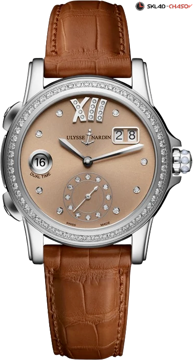 Корпус часов изготовлен с высококачественной нержавеющей стали. Циферблат инкрустирован 8 бриллиантам. Заводная головка из стали на 3:00 часах, украшена 12 бриллиантами. бщее количество бриллиантов 32 шт., весом 0,10 карата. Вынесенная секундная стрелка на 6 часах, индикатор запаса хода на 3 часах, дата на 2 часах, на 9 часах индикация домашного времени.