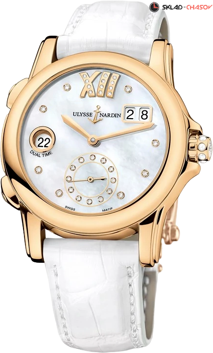 Корпус часов изготовлен золота 750 пробы. Циферблате перламутрово-белого цвета украшен крупной римской цифрой XII из цельного розового золота и часовыми метками из 8 бриллиантов.В положении на 6 часов разместился секундный счетчик с малой стрелкой, окружность декорировано 12 бриллиантами. Стрелки, заводная головка выполнены из розового золота 750 пробы.