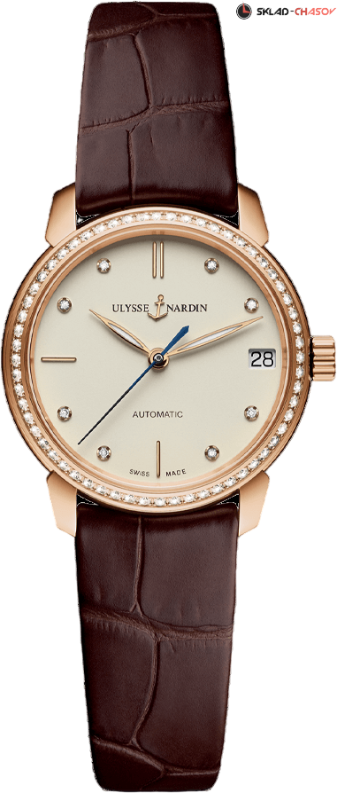 Часы выпущены в корпусе из розового золота 18к, размером 31 мм и водонепроницаемостью 30 м. Внутри корпуса установлен автоматический механизм, Калибр UN-810. На белом циферблате с золотыми метками и 8-ю белыми бриллиантами отображаются часы, минуты, секунды, дата. Запас хода 42 часа. Часы комплектуются коричневым ремешком из кожи аллигатора с вставкой из розового золота 18к. Безель из белых бриллиантов.