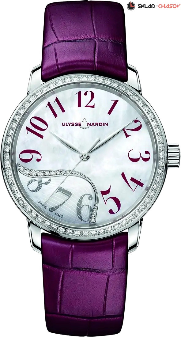 Женские часы в круглом корпусе из нержавеющей стали. Автоматический часовой механизм, калибр Calibre UN-815 с запасом хода 42 часа. 10 бриллиантов в нижней левой части круглого перламутрового циферблата выглядят как изящный гребень волны или капли росы на нежной кромке листа, а еще 76 украшают безель из нержавеющей стали.