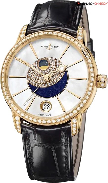 Classico Luna Lady Прекрасные часы для женщин из коллекции Classico Luna сочетают в себе классическую сдержанность и изящные усложнения в виде указателя фаз луны в небольшой круглой апертуре, которая движется по кругу, совершая один оборот за 12 часов. Индикатор лунных фаз помещен в центр циферблата, выполненный из авантюрина и украшенный 72-мя бриллиантами. Роль часовых индексов выполняют накладки из розового золота, установленные на перламутровом циферблате. На позиции «6 часов» размещено окошко с датой. Функции индикации секунд, часов и минут, а также даты и лунных фаз обеспечивает автоматический механизм UN-829 с запасом хода 42 часа. Этот калибр был разработан совместно с известным часовым мастером Людвигом Охслином, автором знаменитой «Трилогии времени» от Ulysse Nardin. Модель поставляется в 35-миллиметровом корпусе из 18-каратного розового золота с инкрустированными бриллиантами рантом и ушками, на черном ремешке из кожи аллигатора.