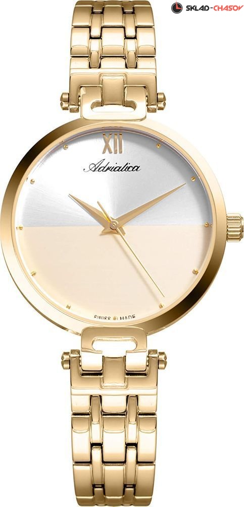 Женские наручные часы Adriatica на стальном браслете. Двухцветный циферблат имеет часовую разметку и римские цифры. Точность хода обеспечивает швейцарский кварцевый механизм Ronda 763. Вес часов 60 грамм. Гарантия 2 года.
