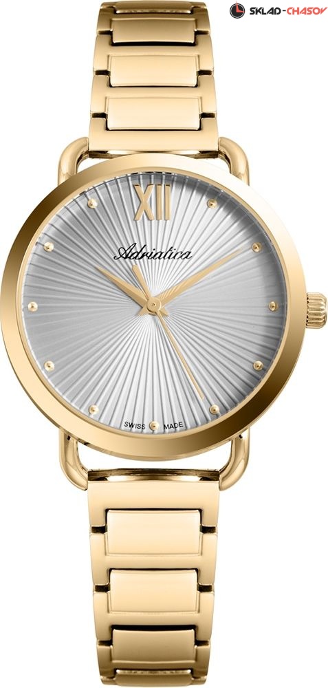 Женские классические часы Adriatica на стальном браслете. Точность хода обеспечивает швейцарский кварцевый механизм Ronda. Вес 80 грамм. Гарантия 2 года.