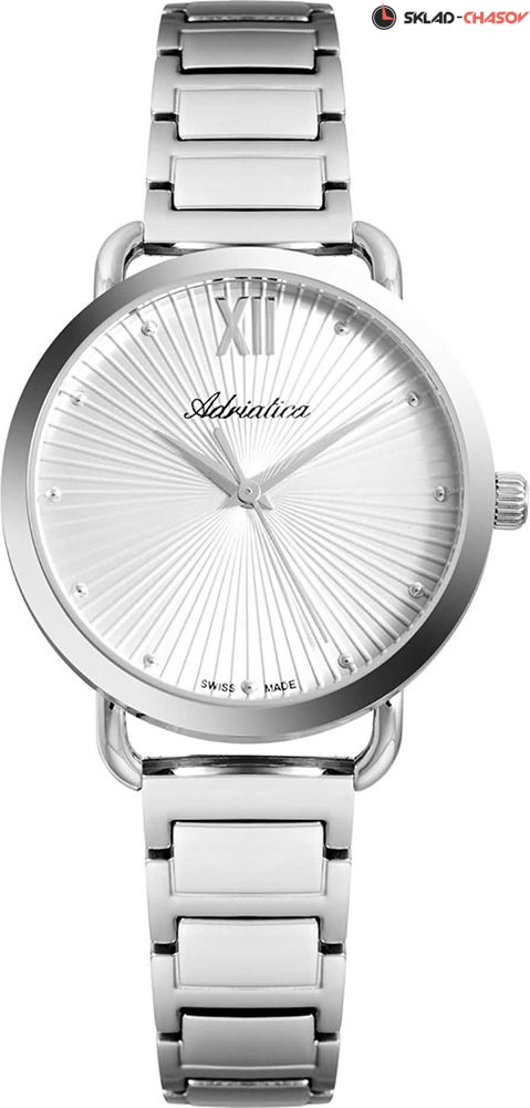 Женские классические часы Adriatica на стальном браслете. Точность хода обеспечивает швейцарский кварцевый механизм Ronda. Вес 80 грамм. Гарантия 2 года.