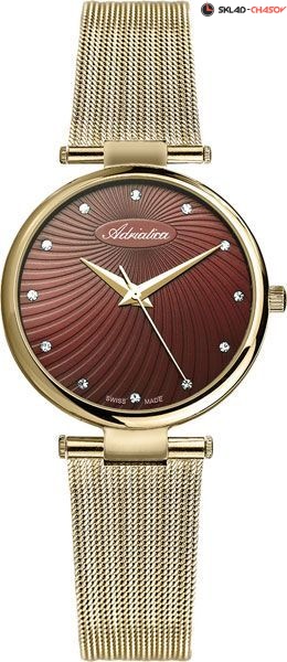 Женские наручные часы Adriatica на браслете, выполненном в технике миланского плетения. Циферблат украшен кристаллами. Точность хода обеспечивает швейцарский кварцевый механизм Ronda 763. Гарантия 2 года.