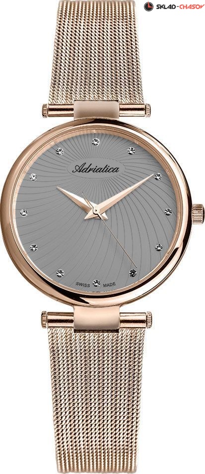 Женские наручные часы Adriatica на браслете, выполненном в технике миланского плетения. Циферблат украшен кристаллами. Точность хода обеспечивает швейцарский кварцевый механизм Ronda 763. Гарантия 2 года.