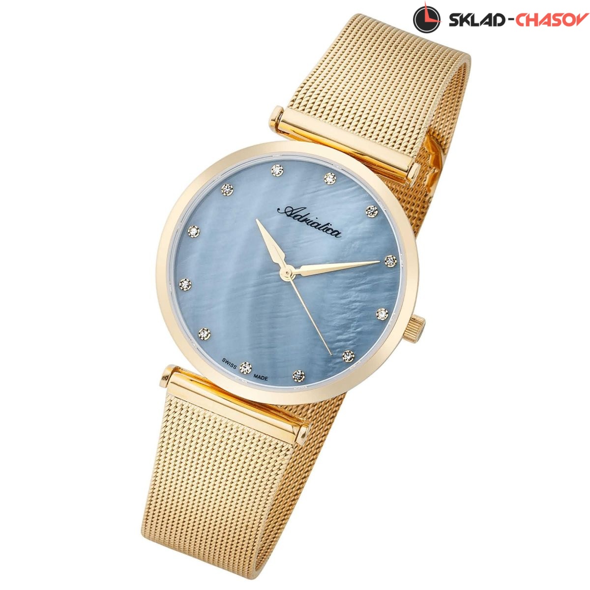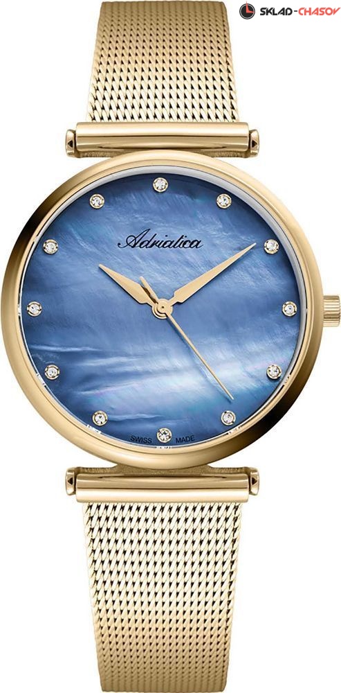 Женские классические наручные часы Adriatica на стальном браслете миланского плетения. Перламутровый циферблат украшен 12 фианитами, расположенными на местах часовых меток. Точность хода обеспечивает швейцарский кварцевый механизм ETA F04. Вес часов 55 грамм. Гарантия 2 года.