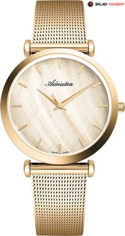 Классические женские наручные часы Adriatica на стальном браслете миланского плетения. Точность хода обеспечивает швейцарский кварцевый механизм ETA F04. Вес часов 65 грамм. Гарантия 2 года.